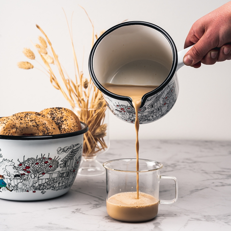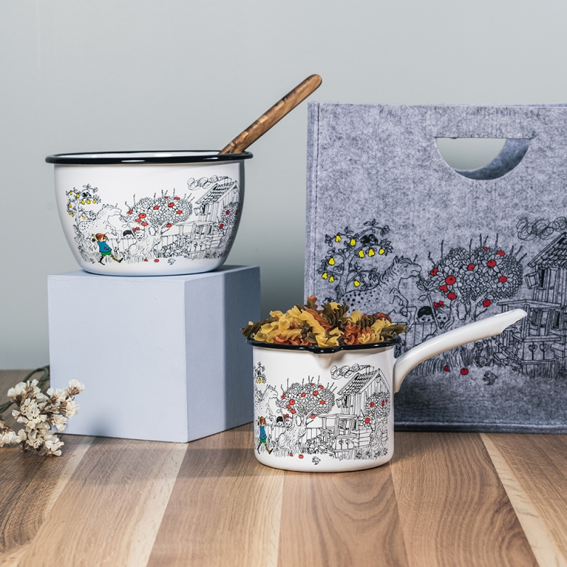 Beautiful enamel saucepan with the motif of the legendary character Pippi Longstocking from the pen of Astrid Lindgren and her illustrator Ingrid Vang Nyman. Pippi walks into the Villa Vilekuly and her friends Tommy and Annika peek behind the fence. You can cook children's porridge, heat cocoa and prepare all kinds of goodies in the saucepan. The beak makes it easier to pour or serve.