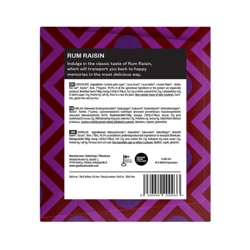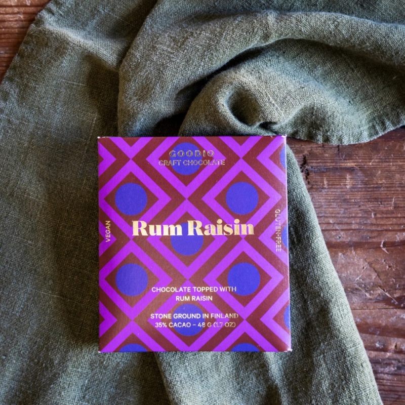 Finnish chocolate house Goodio uses the best organic Criollo cocoa beans from Peru. The beans are ground for three days in stone mills, giving the chocolate a velvety consistency and delicious taste. Rum Raisin chocolate is a tribute to the classic combination that the Finns have raised to a new level - with the purity of natural ingredients and a touch of Nordic minimalism. Everything is completed with beautiful design packaging, which makes the chocolate perfect for gifting.