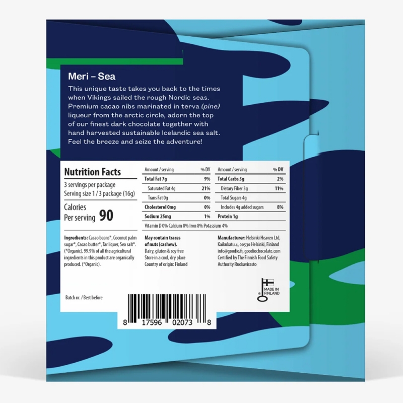 Finnish Sea chocolate will surprise you with a sophisticated combination of pieces of sea salt and a typical Finnish ingredient - natural tar.