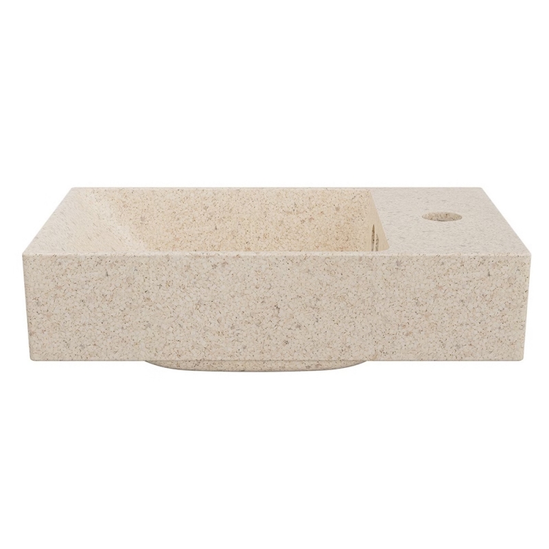 The Cube40 Slim rectangular designer washbasin made of a natural composite of solid aspen wood and resin will give your bathroom a pleasant and peaceful atmosphere. It is designed to fit perfectly into small spaces, making it an ideal solution for a separate toilet or compact home bathroom. A small shelf or cabinet can easily be placed under the washbasin. Despite its compact dimensions, the washbasin is wide enough for comfortable hand washing. The sophisticated yet simple timeless design lets the unique structure stand out. The innovative material directly from the Woodio workshop is impermeable, easy to maintain, 100% recyclable and the production leaves an 80% lower carbon footprint than classic ceramic washbasins. The manufacturer guarantees the quality with an extended 5-year warranty. This version has a tap hole located on the right side.