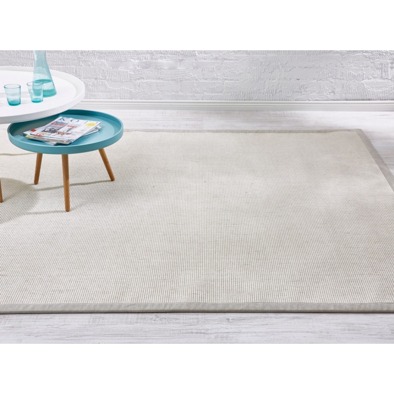 Esmeralda piece rug made of wool and paper fiber in a beige shade with a wide border. The wool makes the rug pleasant to the feet and is ideal for the bedroom, living room or dining room.