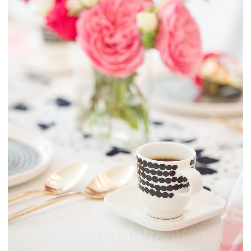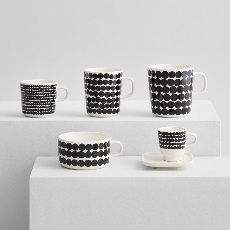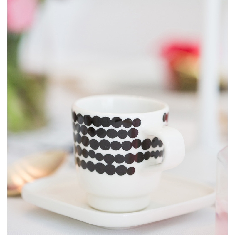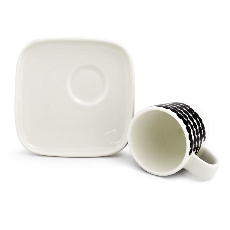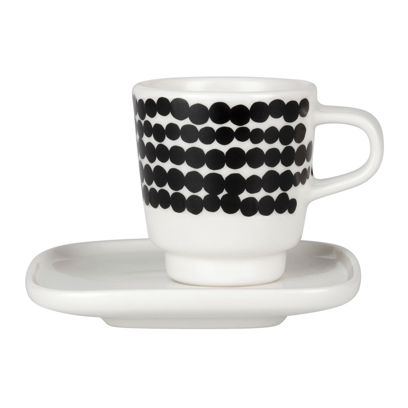 The porcelain espresso cup and saucer with the original pattern of irregular Siirtolapuutarha beads will create a truly relaxing atmosphere in your home. The square saucer can also be used as a plate for a sweet dessert, which will make your coffee session perfect. The black Scandinavian motif on the pure white porcelain is elegant and you can easily combine it with, for example, kettles and dishes from the Oiva collection.