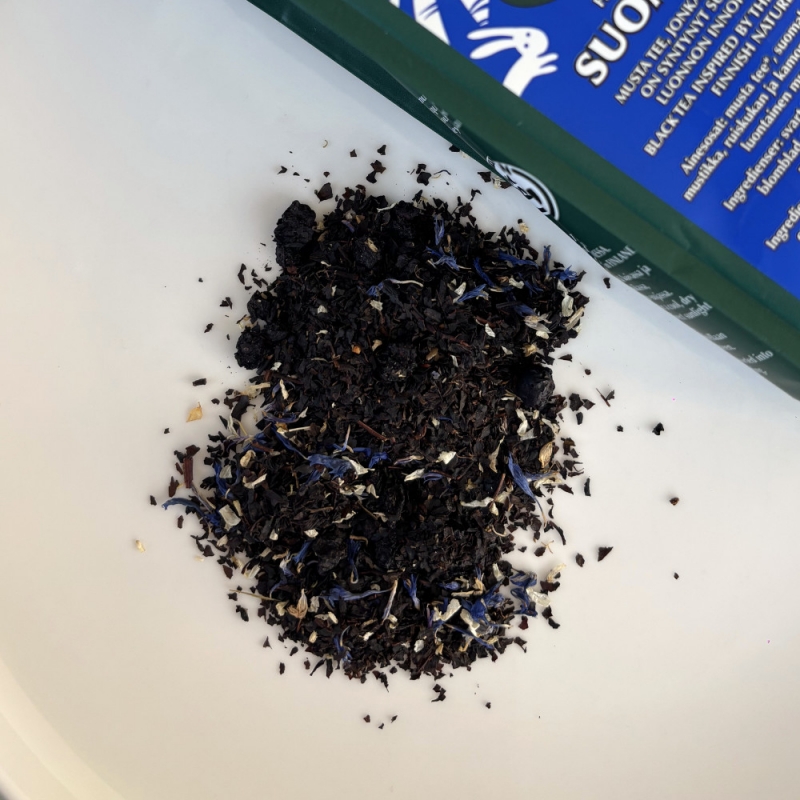 Black tea, dried Finnish blueberries, blue cornflowers petals, white chamomile petals.