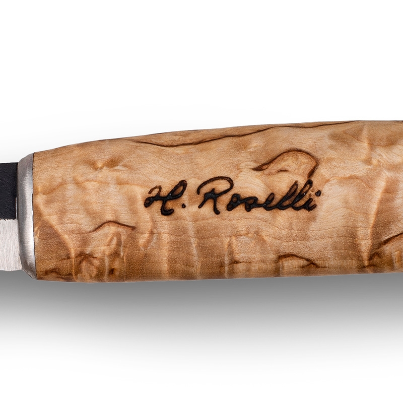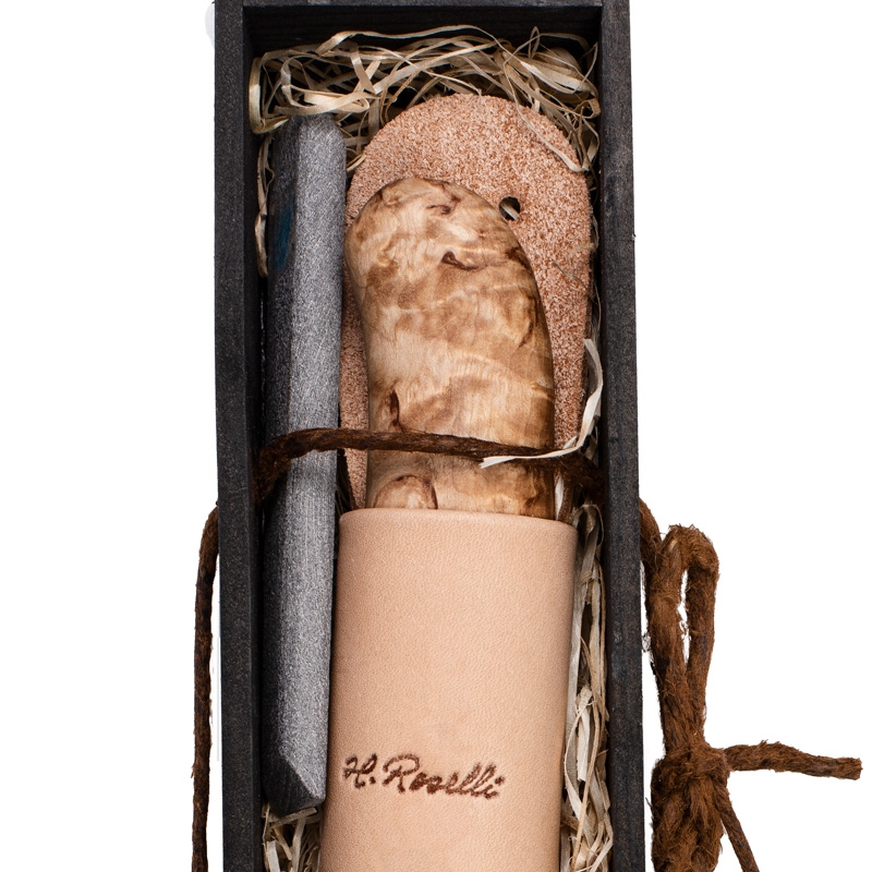 Blade made of Roselli carbon steel from the Finnish Karhula steelworks (hardness 60 HRC), handle made of Finnish curly birch wood, sheath made of genuine leather.