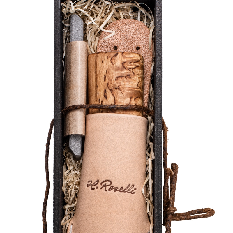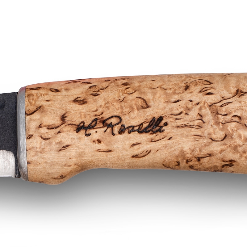 Blade made of Roselli carbon steel from the Finnish Karhula steelworks (hardness 60 HRC), handle made of Finnish curly birch wood, sheath made of genuine leather.