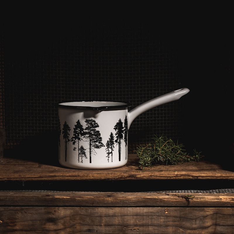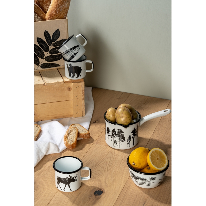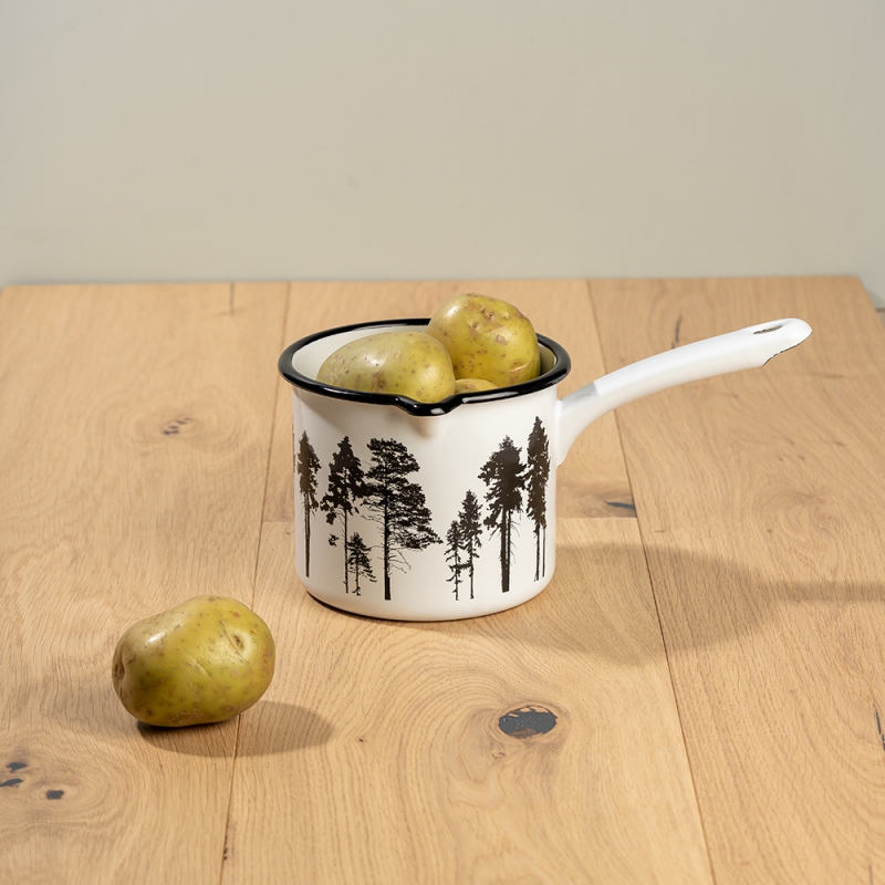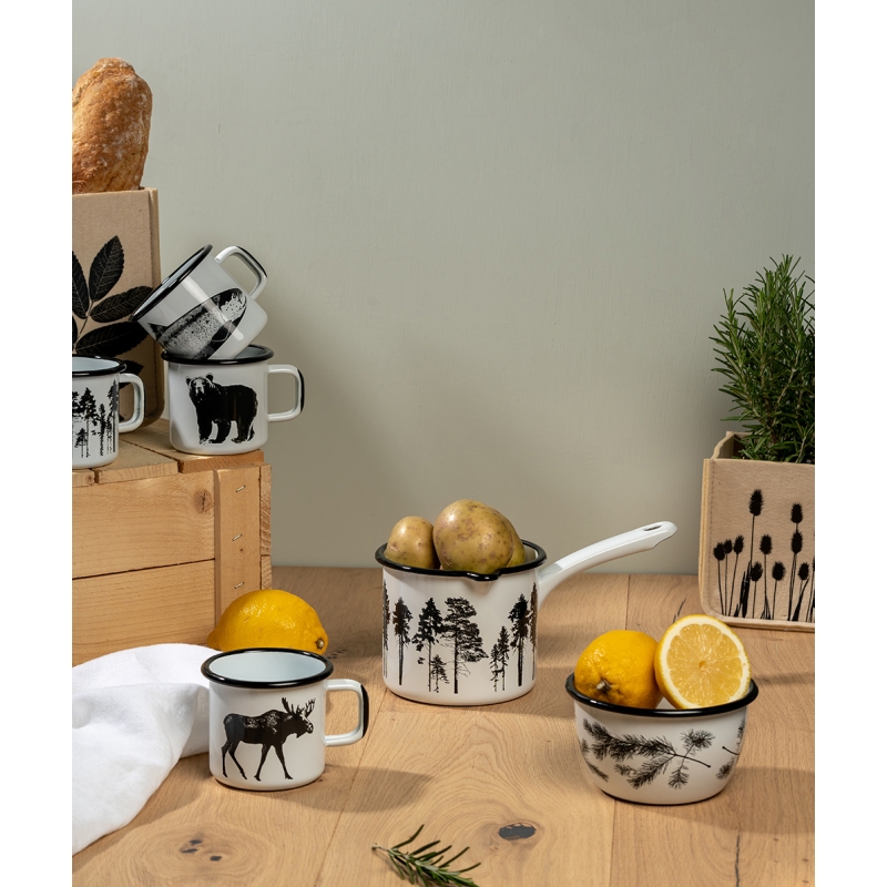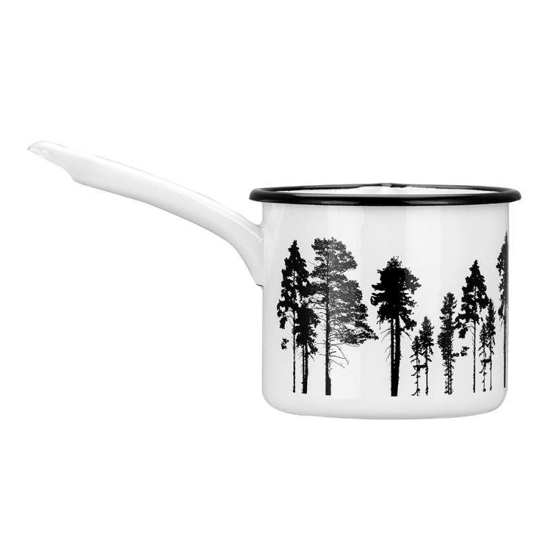 The enameled saucepan from the Nordic collection has a forest motif around the perimeter. A beautiful saucepan in a black and white minimalist style, in which you can cook baby porridge, heat cocoa and prepare all kinds of goodies.