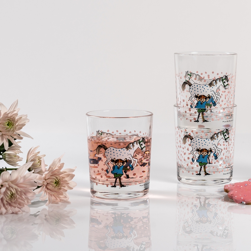 A glass with a motif of the legendary character Pippi Longstocking and her horse from the stories of Astrid Lindgren and her illustrator Ingrid Vang Nyman. The child resident of the abandoned villa Vilekuly experiences many adventures with the children from the neighborhood, which have been loved by children and adults all over the world.
