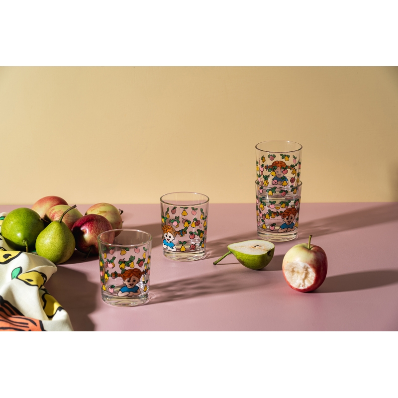 A glass with a motif of the legendary character Pippi Longstocking and her horse from the stories of Astrid Lindgren and her illustrator Ingrid Vang Nyman. The child resident of the abandoned villa Vilekuly experiences many adventures with the children from the neighborhood, which have been loved by children and adults all over the world.