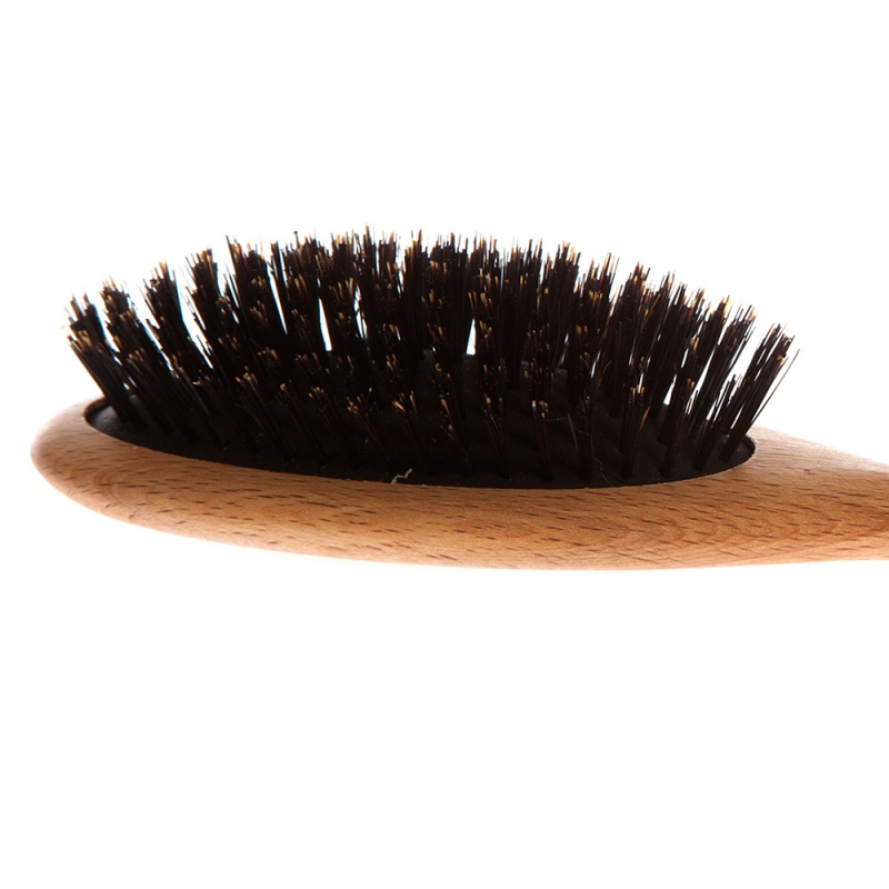 A quality hairbrush made of oiled beech wood, with natural boar bristles and a natural rubber cushion. The bristles are gentle on the hair while gently massaging the scalp. Thanks to their shape, they naturally distribute sebum from the skin to the lengths of the hair, nourishing it, softening it and giving it a natural shine and softness.
