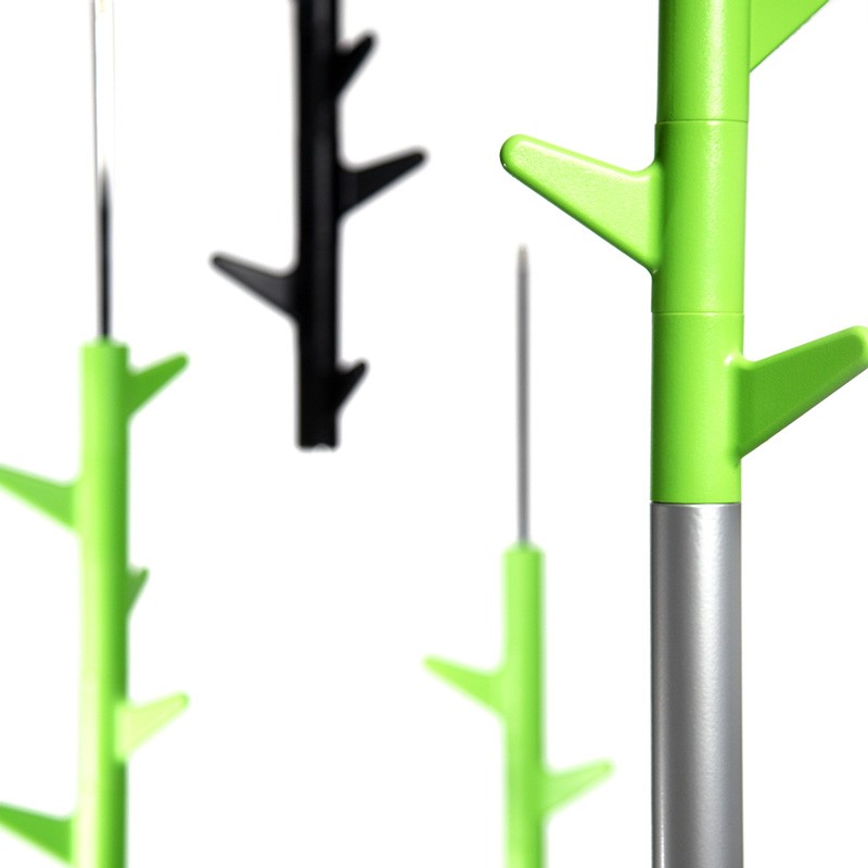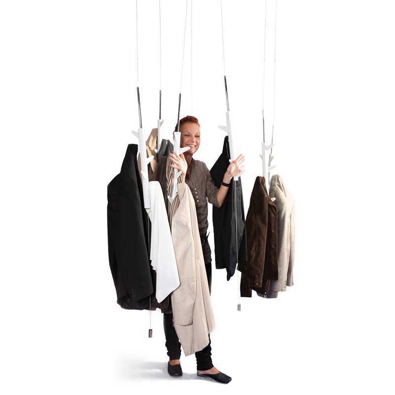 The hanger simply hangs from the ceiling and is stable thanks to the weight. It has six hooks that can be rotated freely, so its capacity fully replaces a regular stand-up hanger. You can adjust the length of the cable from the ceiling anchorage, the usual height of the room for which the hanger is intended is 3 meters. They are also suitable for larger rooms, where several Oka hangers can be hung next to each other to create an interesting functional accessory.