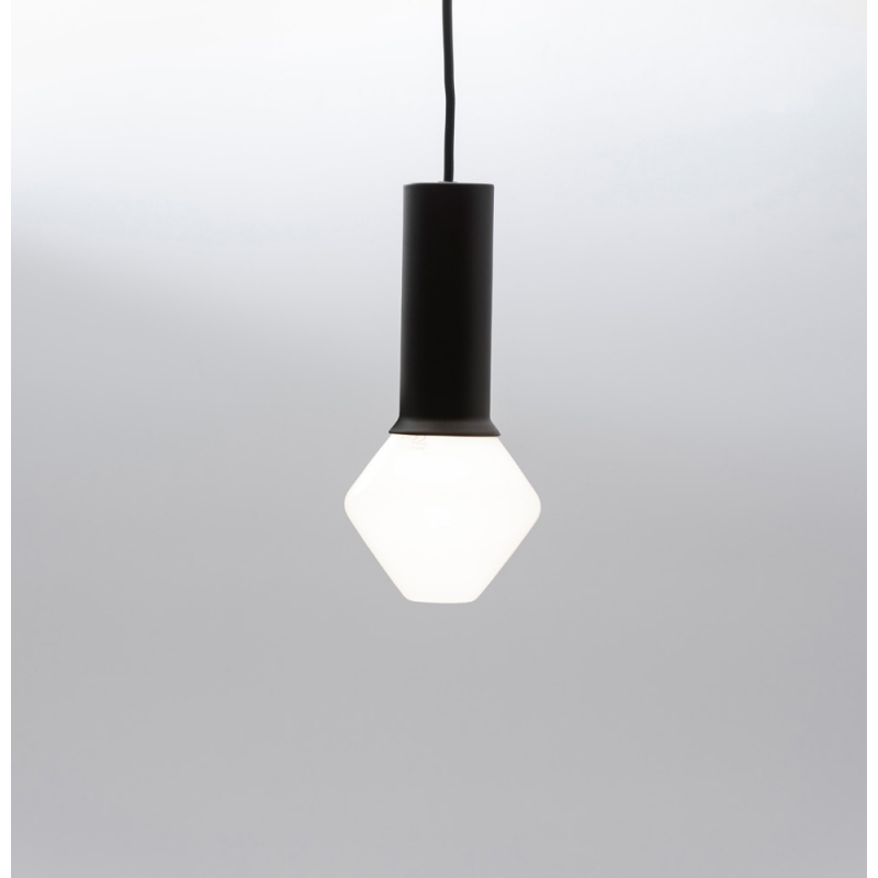 The lamp consists of a dimmable LED light source made of opal glass, a metal base, a black cable and a ceiling cap.