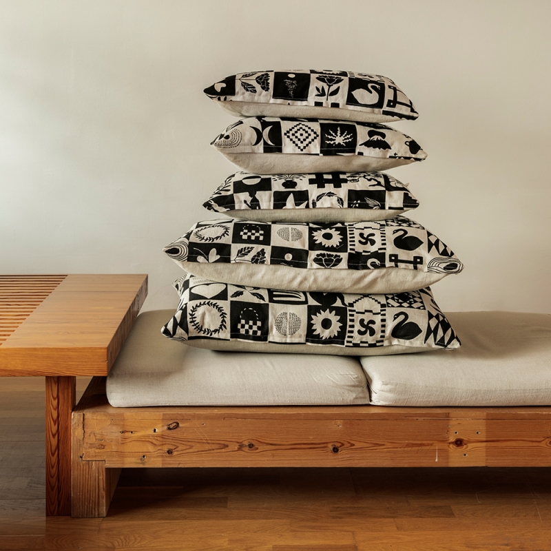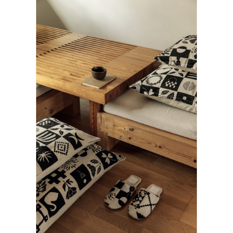 The pillowcase made of premium hemp fiber features the motif Kaukana kotoa (far from home). Life is a patchwork map of our memories. Finnish designers Saana ja Olli have painted the memories and moments that connect the construction of human existence.