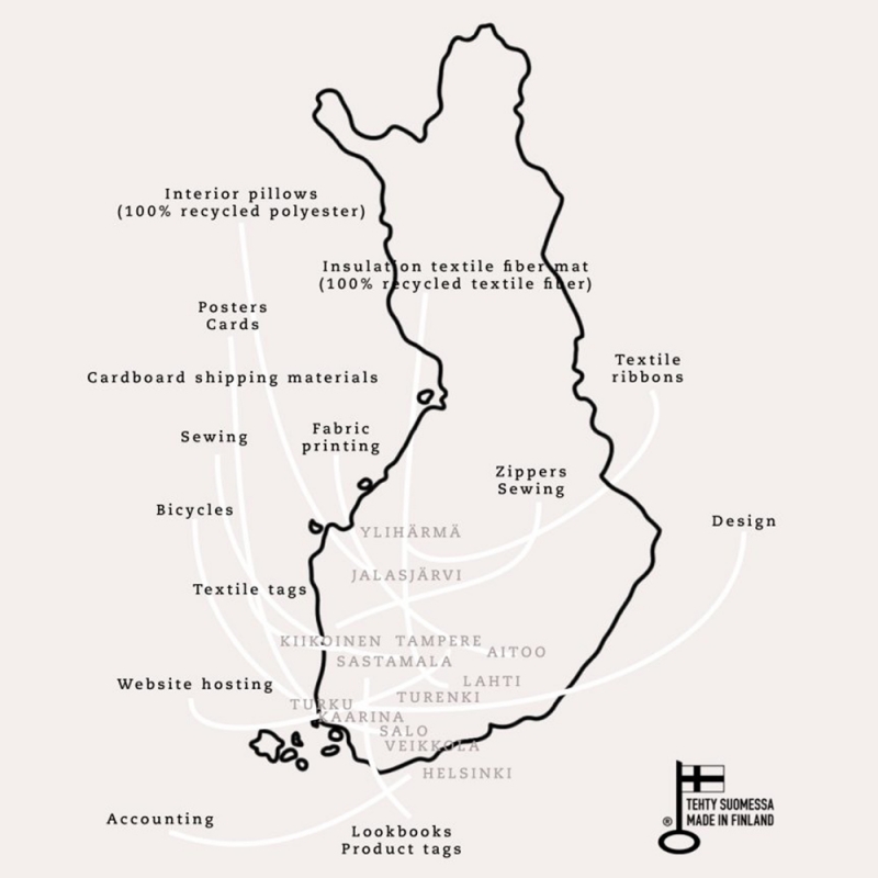 Transparently and sustainably designed, manufactured and packaged in Finland with the Made in Finland trademark. Textile printing and sewing using 100% renewable energy.