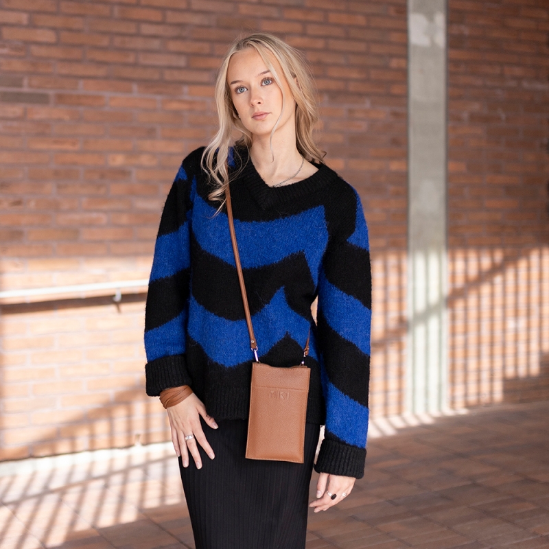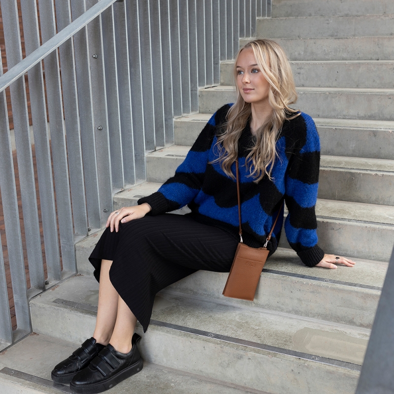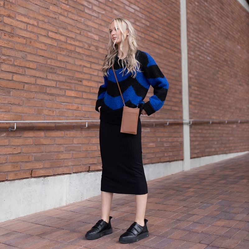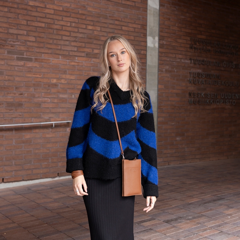 The Hertta mobile phone bag made of genuine elk leather has just enough space for your phone, wallet and keys and a long strap for comfortable carrying over your shoulder. The bag closes with a zipper and there is a separate pocket for credit cards inside. The minimalist and timeless style goes with every outfit and you will always have everything you need at hand.