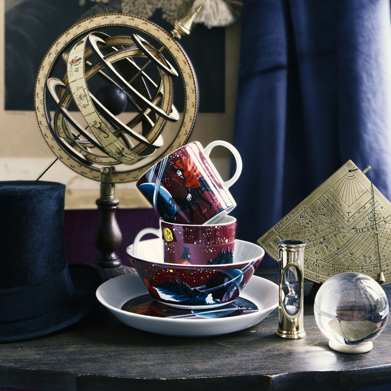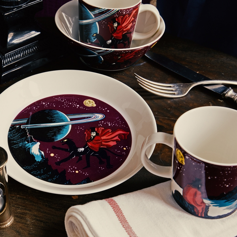 Porcelain bowl with the figure of the powerful wizard Hobgoblin based on the stories from the Enchanted Valley by the famous Finnish author Tove Jansson. Hobgoblin travels through space with his flying panther, longing for the mysterious royal ruby.