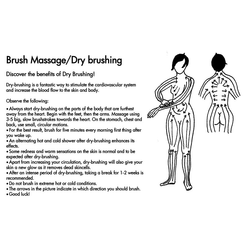 Use the brush only when dry and on dry skin. Start by brushing the extremities of the body using 3-5 long, slow strokes towards the heart. Continue with circular movements to massage the abdomen, chest and back. The massage is best done in the morning and the effects can be enhanced by alternating hot and cold showers after the massage.