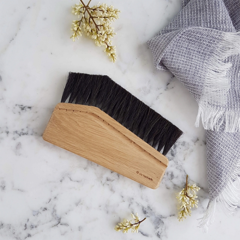 The compact broom will help you quickly clean your work surface. You can easily clean your table, keyboard or display with it. The shape fits well in your hand and the angled cut ensures good movement across the screen without generating static electricity. The handle is made of solid beech wood and the bristles of the brush are made of sustainably sourced horsehair and have excellent strength and elasticity.