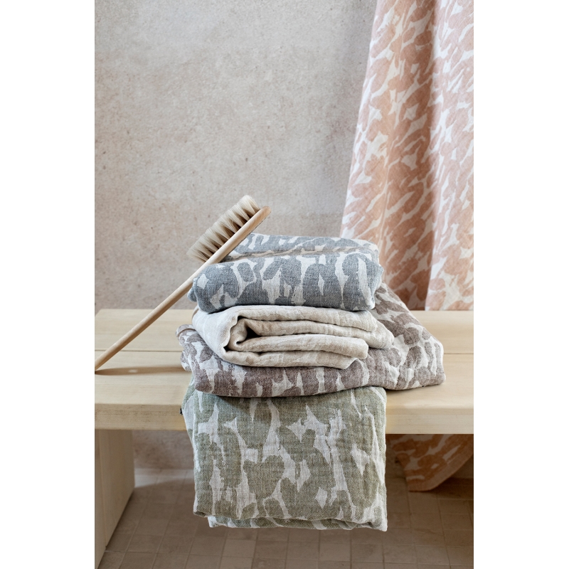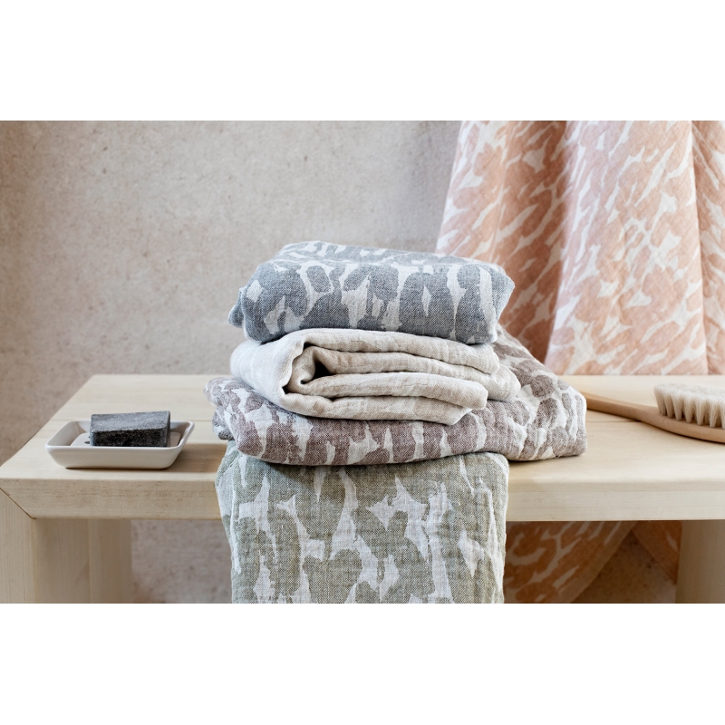 The towel is woven from 100% linen with a Nordic Jäkälä (lichen) pattern, inspired by the forest covered in lichen. Linen dries quickly and feels nice on the body. The large towel can also be used as a simple kilt by wrapping it around your waist in the sauna, and it also works great as a beach towel at the seaside.