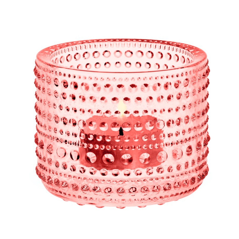 The salmon glass candlestick from the Iittala Kastehelmi collection stands out with its subtle design inspired by dew drops, which in the form of glass bubbles play out a real symphony of light. The glass contains a rare red dye. Packaged in a gift box.