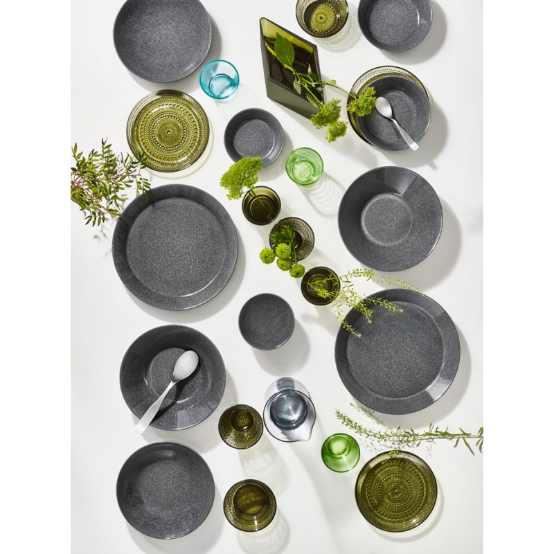 The green glass plate from the Iittala Kastehelmi collection stands out with its subtle design inspired by dewdrops, which in the form of glass bubbles create a real symphony of light. It is perfect for appetizers and desserts.