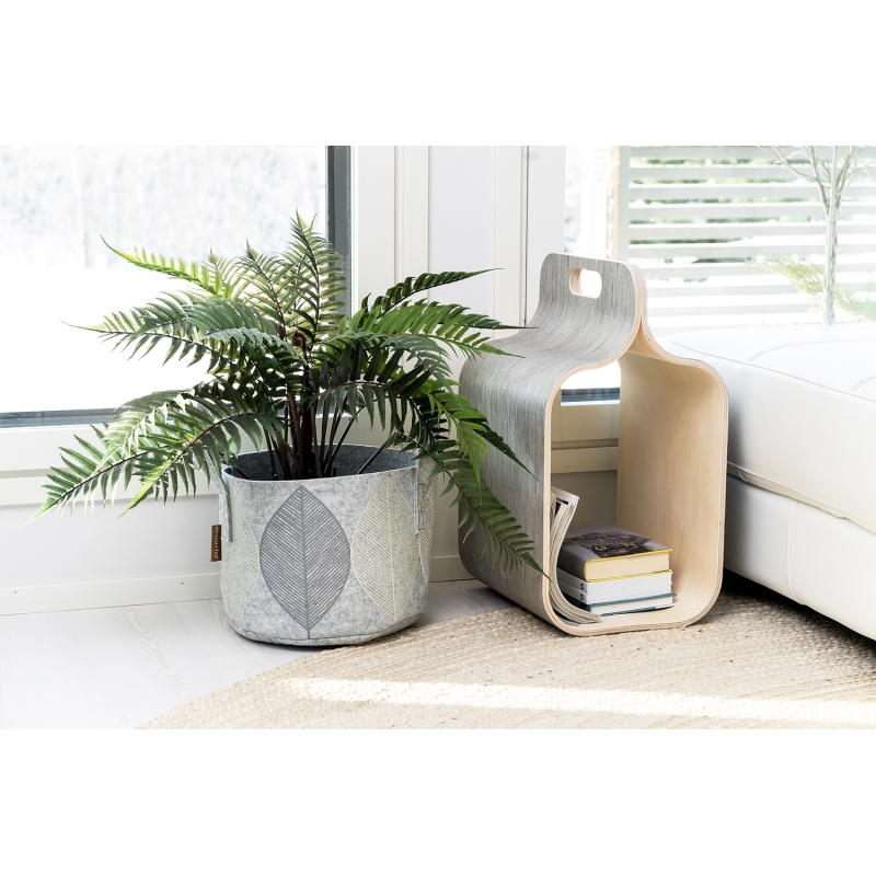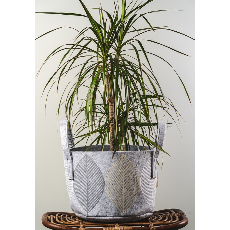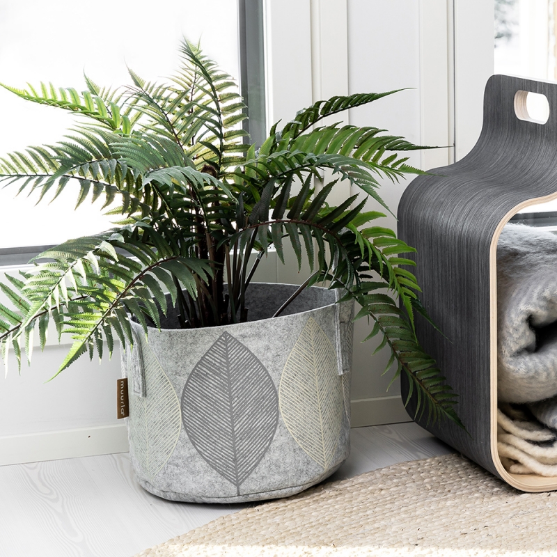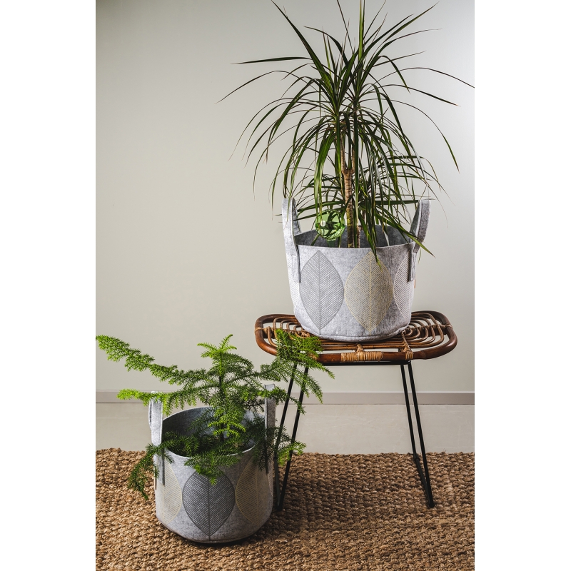 Felt multifunctional storage basket with a leaf motif on a gray background. The felt material is lightweight yet durable in use. The storage basket offers endless possibilities. You can hide toys, magazines, pillows or use it as a stylish cover for a flower pot.