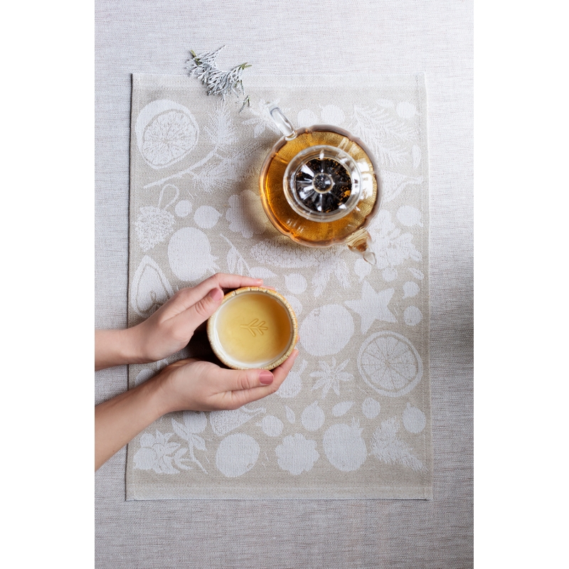The linen table setting with the Talven Tuoksut (Finnish for the scent of winter) motif was designed by Finnish designer Saara Obele. Star anise, dried orange, pomegranate, pine needles, all of these are part of the festive atmosphere and, in fact, every winter.