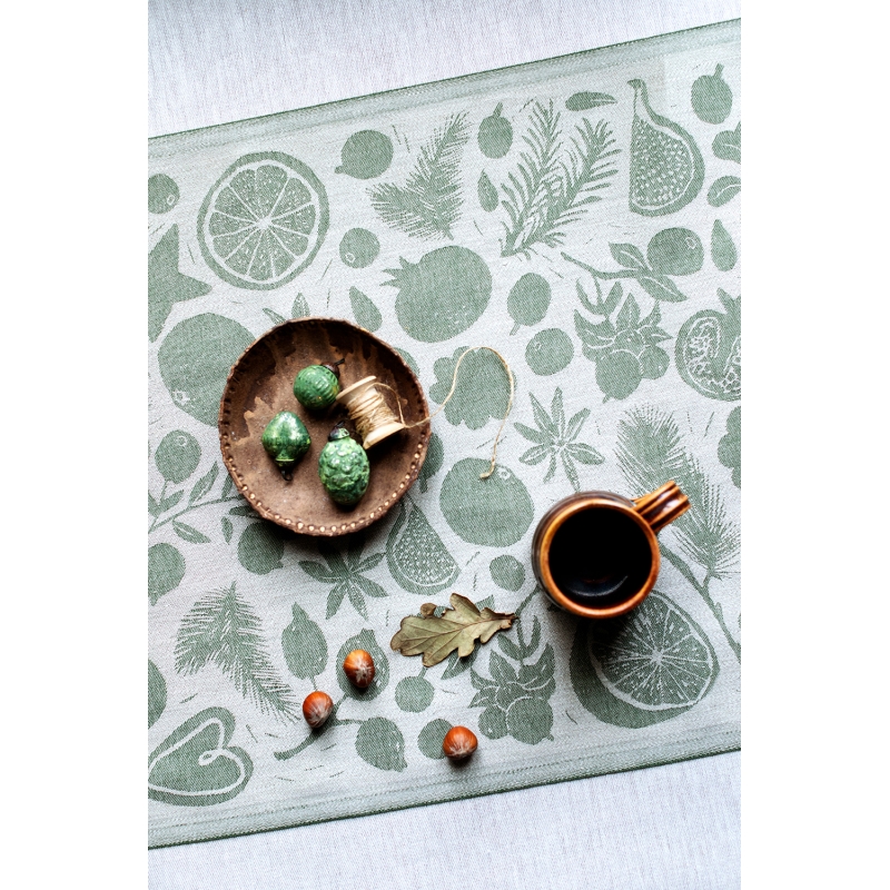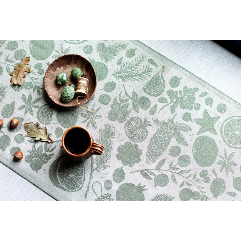 The linen table runner with the Talven Tuoksut (Finnish for the scent of winter) motif was designed by Finnish designer Saara Obele. Star anise, dried orange, pomegranate, pine needles, all of these are part of the festive atmosphere and indeed of every winter. The runner does not necessarily have to end up only on the dining table, but can also be used as a decoration in the living room, for example.