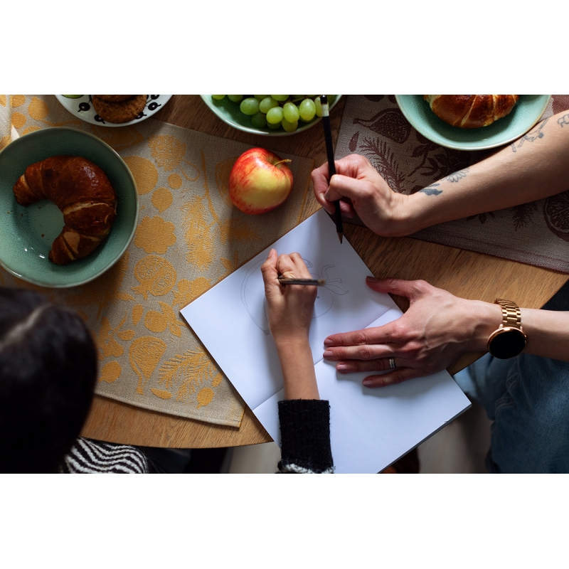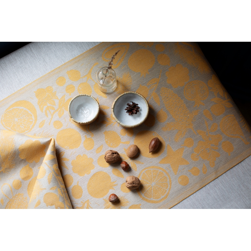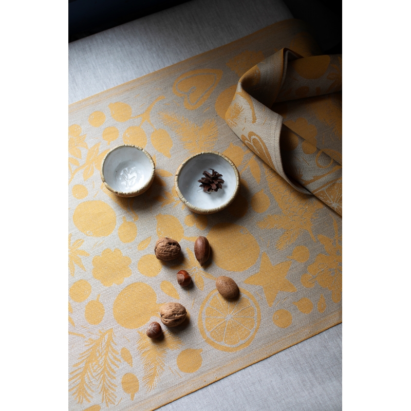 The linen table runner with the Talven Tuoksut (Finnish for the scent of winter) motif was designed by Finnish designer Saara Obele. Star anise, dried orange, pomegranate, pine needles, all of these are part of the festive atmosphere and indeed of every winter. The runner does not necessarily have to end up only on the dining table, but can also be used as a decoration in the living room, for example.