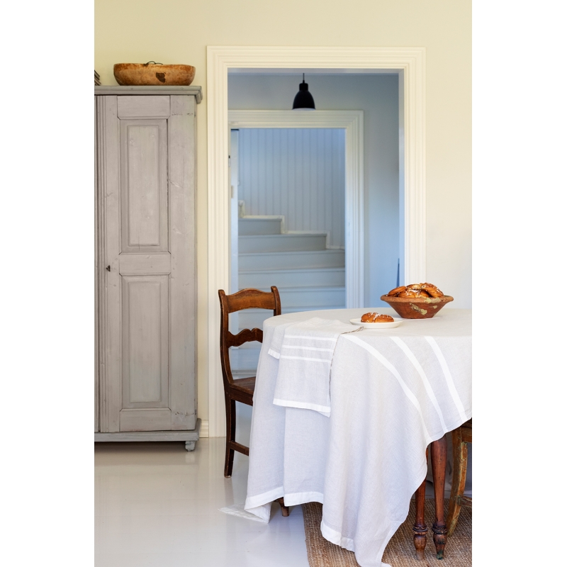High-quality large Usva tablecloth made of 100% linen in a minimalist combination of a base in a natural shade of linen and white stripes on the sides.