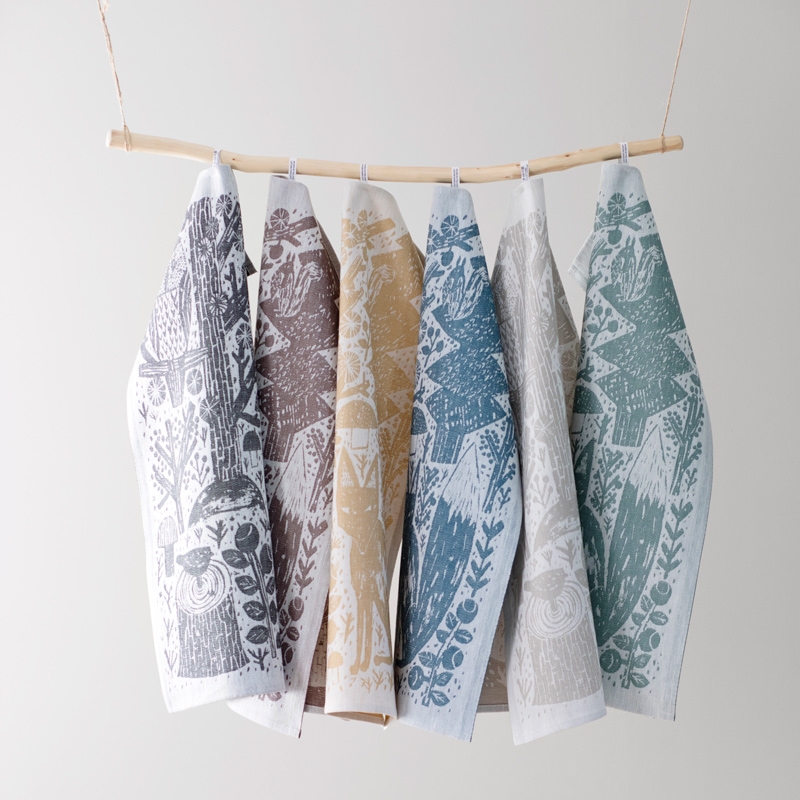 Metsikkö (Finnish for grove) dishcloth with a cheerful animal and plant motif, designed by Finnish designer and painter Matti Pikkujämsä. On one side, the dishcloth is dark with a light pattern, on the other side, the background is light and the pattern is dark. Thanks to its composition of a mixture of linen and organic cotton, the dishcloth is highly absorbent and at the same time pleasant to the touch.
