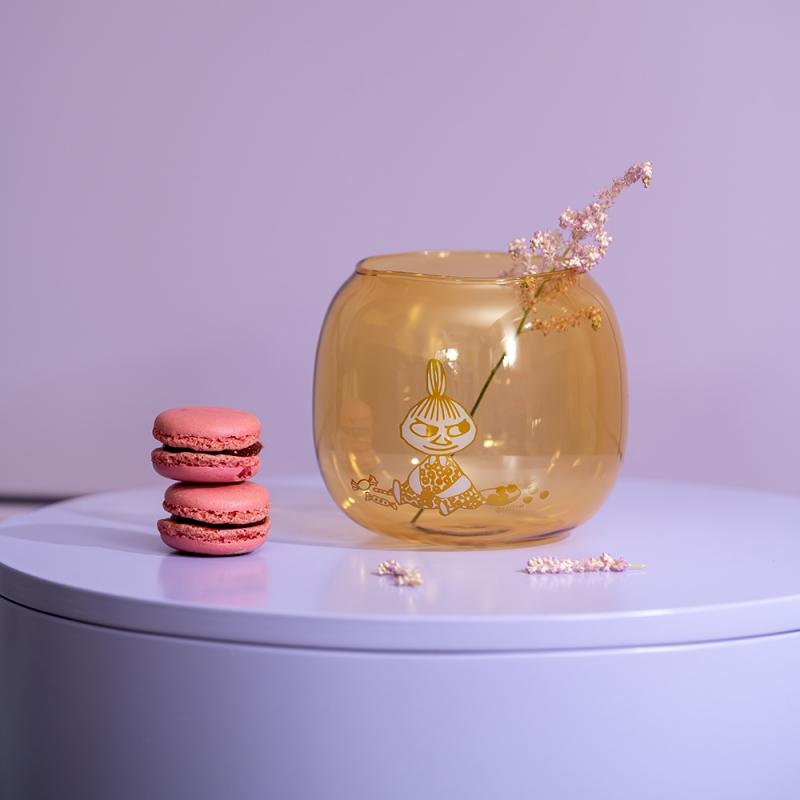 Yellow glass candlestick decorated with the motif of Little My from the Moomin fairy tales by the famous Finnish author Tove Jansson. The candlestick is packaged in a gift box.