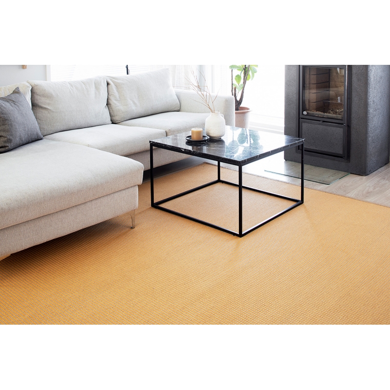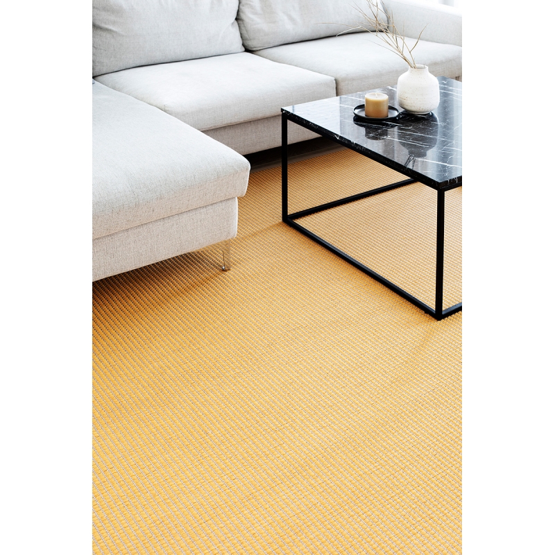 Lyyra piece rug made of cotton and paper fiber in a yellow shade with a wide border. Cotton interwoven with paper fiber is elegant and pleasant to the feet. The rug is therefore ideal for the bedroom, living room or dining room.