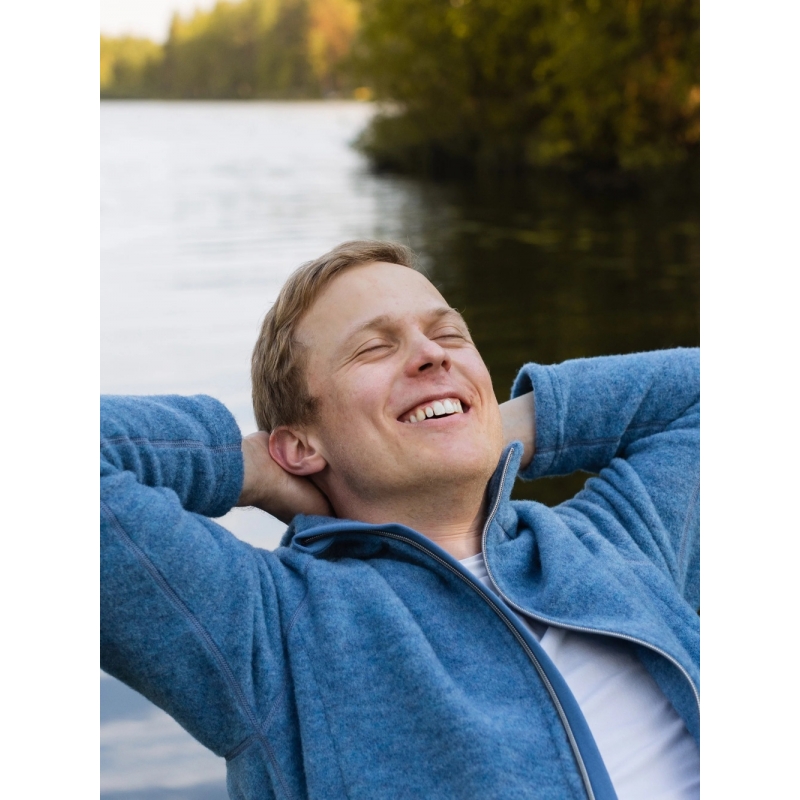 The practical men's cut with a two-way zipper, two outer zipper pockets and two inner pockets made of fine organic cotton knit provides plenty of space for small items and comfort when wearing. Pure merino wool fleece does not contain any synthetic fibers and therefore no microplastics. Wool is naturally fire-resistant, regulates temperature and warms even in damp conditions. It also neutralizes odors - often just airing is enough, washing is not necessary after each use.