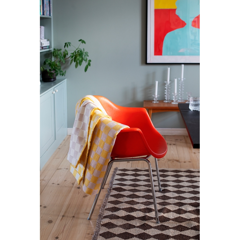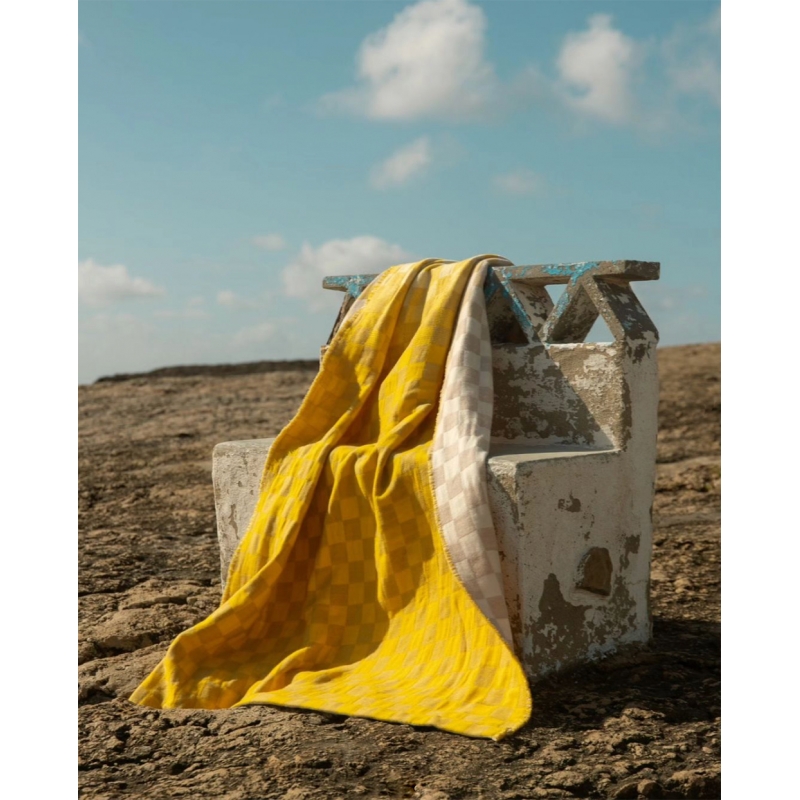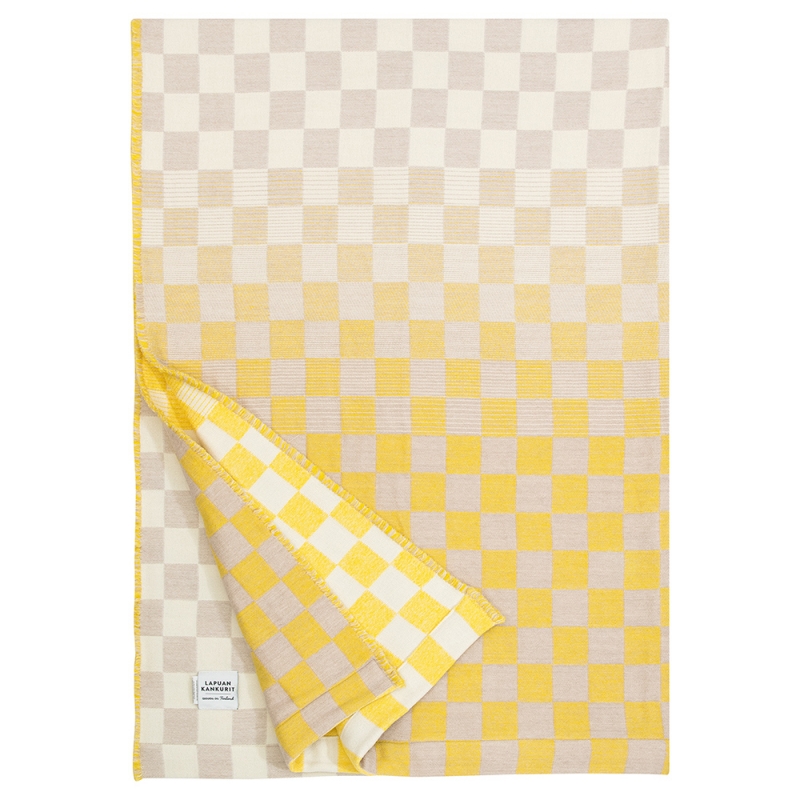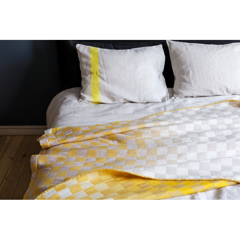 A luxurious blanket woven from premium Australian merino wool and organic cotton with an elaborate Shakki motif, designed for the Finnish textile company Lapuan Kankurit by the talented Finnish designer Ida Korsström. The checkered pattern cleverly blends beige, yellow and white shades, creating an incredible interplay of colors. The blanket has a yellow-beige gradient on one side and yellow-white on the other, so you can easily change the impression of the interior. Thanks to the soft and delicate material, the blanket will hug you and warm you whenever you need it.