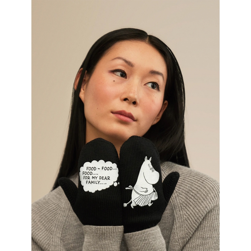 Luxurious Finnish mittens with a reflective motif of the mother from the fairy tale Moomin by the famous Finnish author Tove Jansson are knitted from merino wool in Tampere, Finland and printed in Helsinki. The top-quality merino wool is pleasantly soft on the skin and does not create any pilling. The double-layer knit will keep your hands warm even in the deep (Nordic) winter.