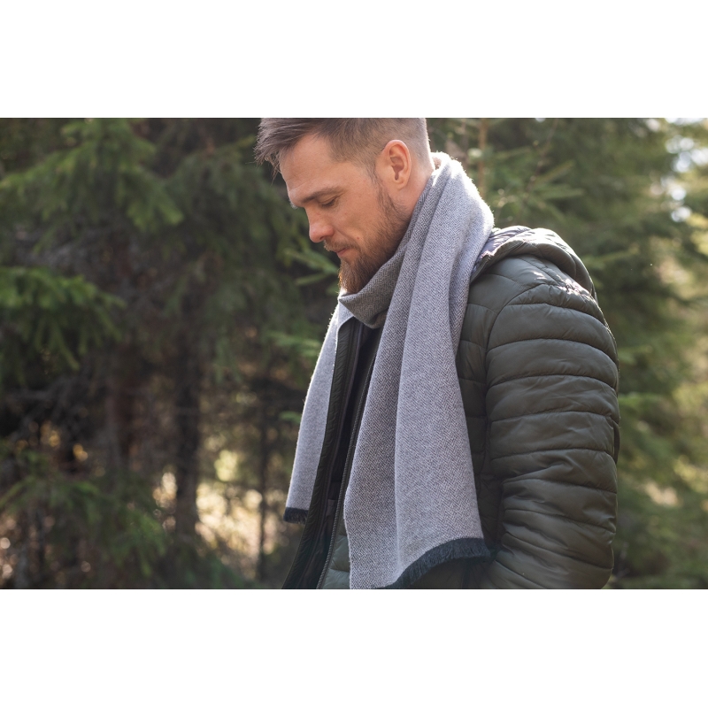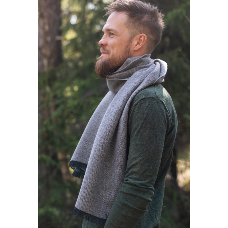 The exclusive Hanki scarf is woven in a Finnish weaving mill from premium merino wool, which is incredibly pleasant to the touch and will keep you warm whenever you need it. The scarf has a subtle woven pattern in neutral shades of gray and is decorated with fine short fringes at the ends.