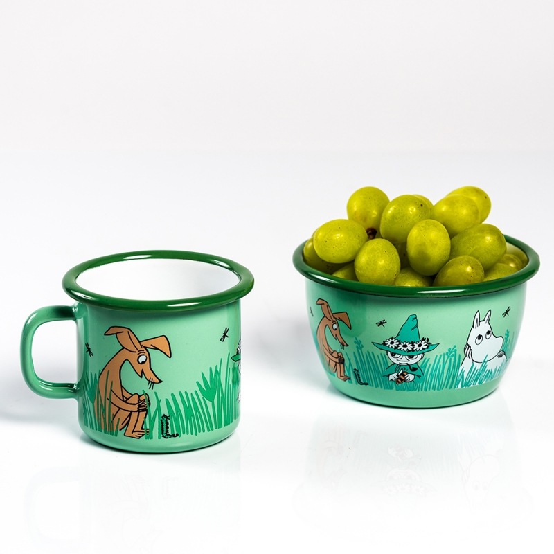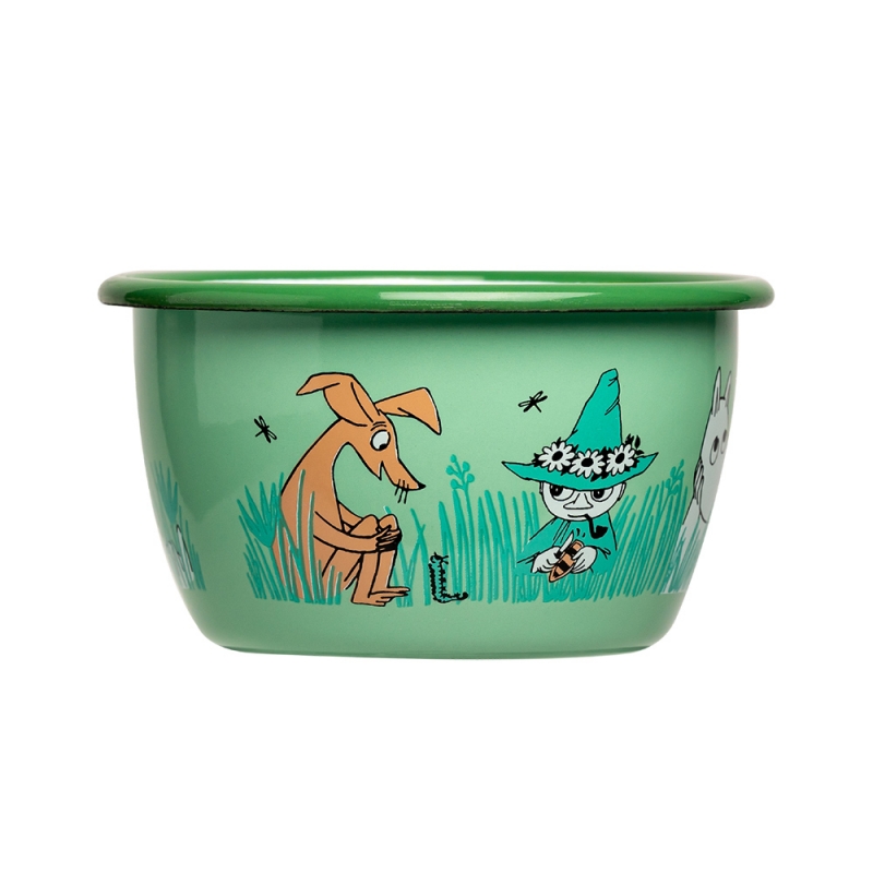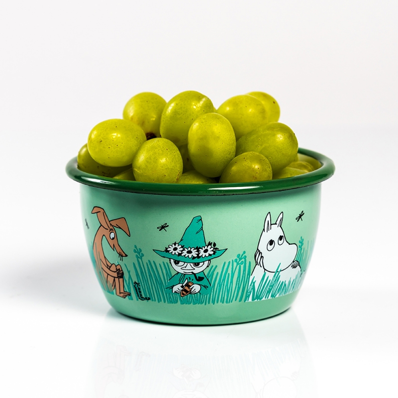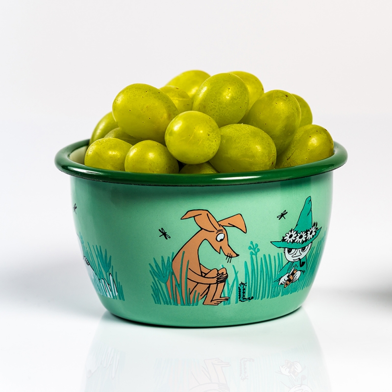 Cute enamel bowl Boys from the In the garden collection based on the fairy tale Moomins by the famous Finnish author Tove Jansson. Around the perimeter we find the characters Moomin, Snout and Snout. The smaller bowl with Moomin is ideal for morning cereals, semolina porridge, compotes or perhaps for nuts during an evening gathering.