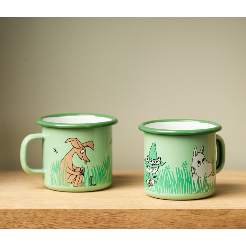 Green enamel mug Boys from the In the garden collection based on the Moomin fairy tale by the famous Finnish author Tove Jansson. Around the circumference of the mug we find the characters Moomin, Snorkmaiden and Snout.