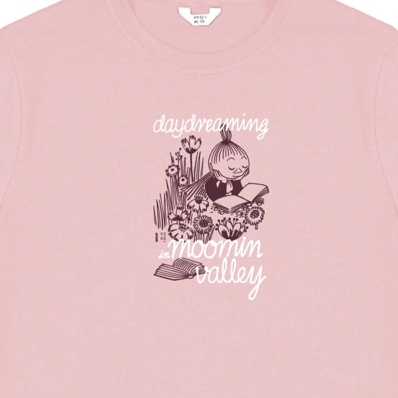 A quality T-shirt in soft pink with a motif of beautiful Mymble brings a light atmosphere from the world of Moomin fairy tales by the famous Finnish author Tove Jansson. Mymble is enjoying the first warm rays of the sun and has stopped for a moment, while little Mia is already frolicking somewhere. What is she thinking? Maybe she is dreaming of a peaceful afternoon... or another little adventure.