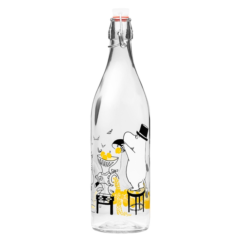 A designer glass bottle with a cap decorated with a cute motif of the fairy-tale Moomins processing the summer harvest. Fill it with clean water, homemade syrup, lemonade or prepare fresh juice in it. The main characters of the stories from Moominvalley will make you happy every day.