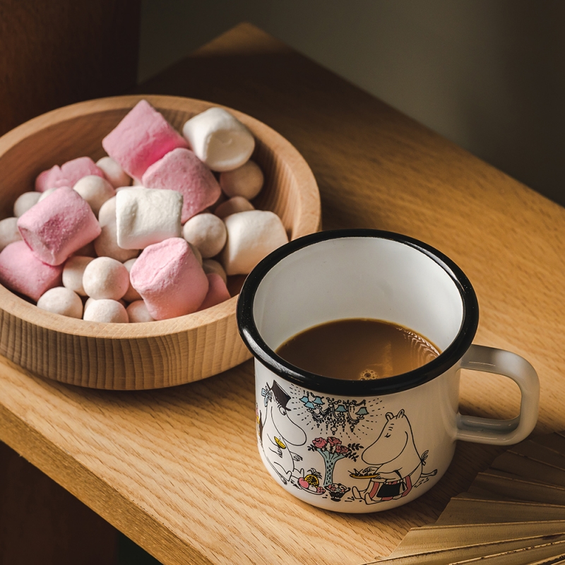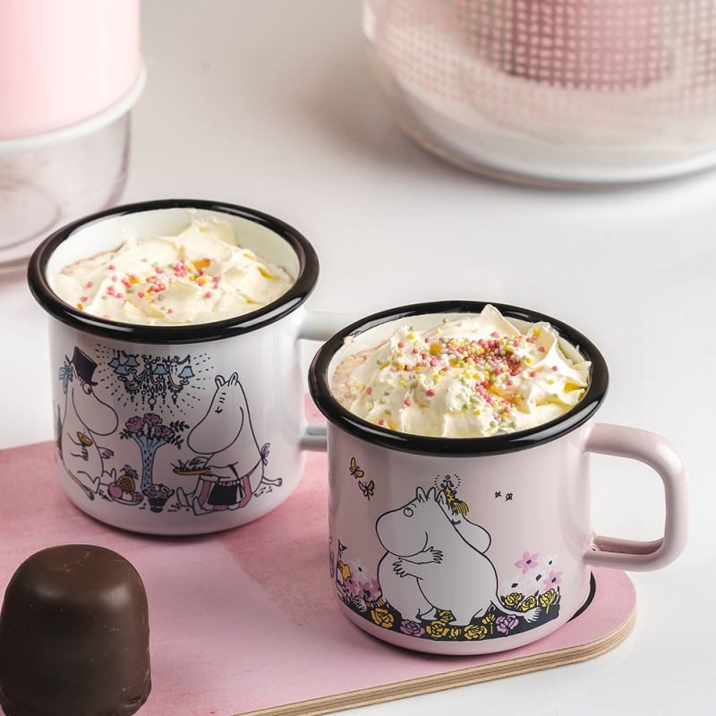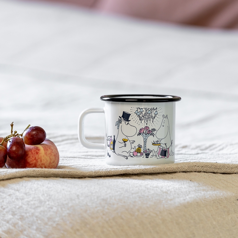 Cute enamel mug Date night based on the Moomin fairytale by the famous Finnish author Tove Jansson. The motif of Moomin mom and dad "on a date" is a beautiful expression of affection for the person you love.