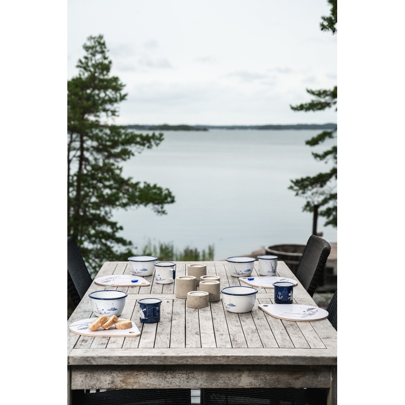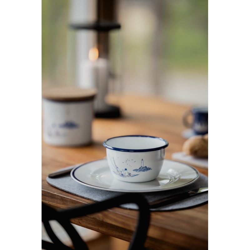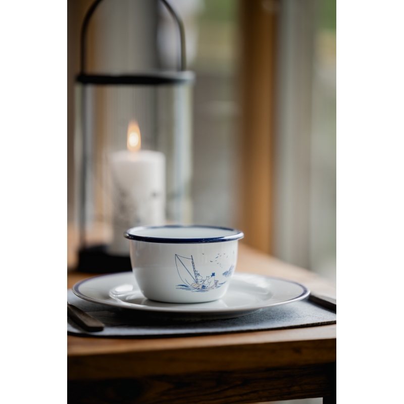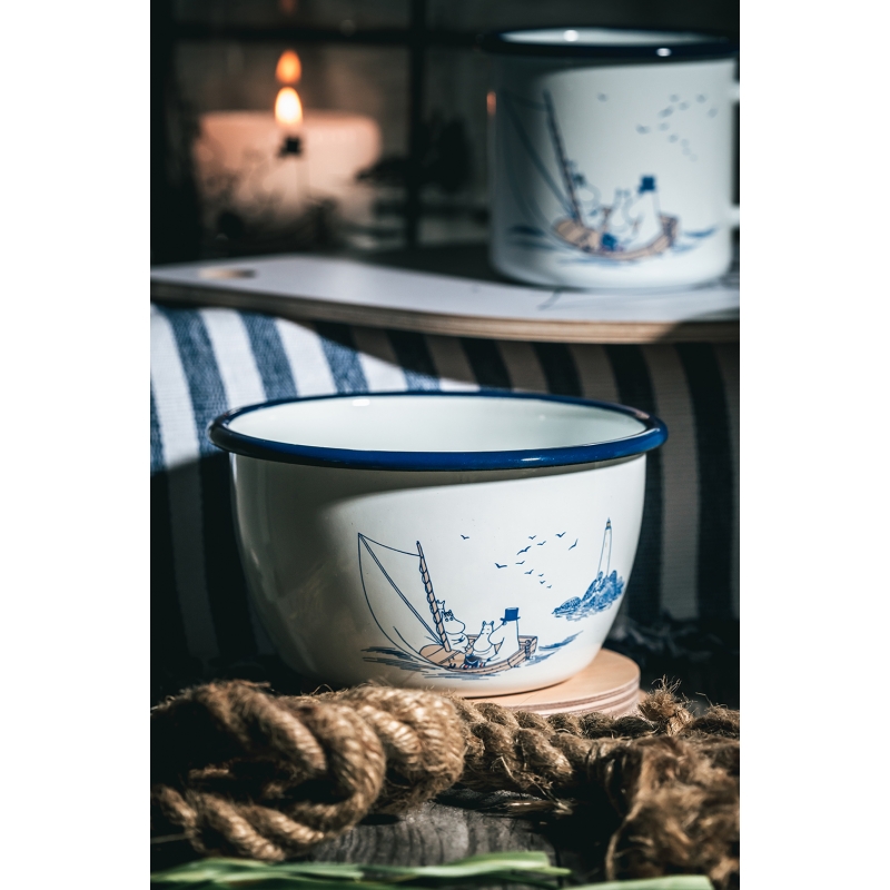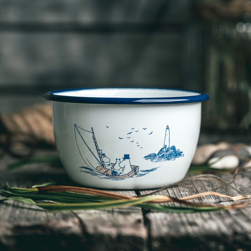 Sailors Hello! The lovely enamel bowl Moomin Sailors based on the Moomin stories by the famous Finnish author Tove Jansson depicts the main characters on a boat with a lighthouse in the background. Tove Jansson loved the sea, which plays an important role in her stories. The beautiful motif is complemented by a stylish blue rim. The bowl is ideal for morning cereals, semolina porridge, compotes or even nuts during an evening gathering. A great gift for all adventurers and sailors who have the fairy tales from Moomin Valley stuck in their hearts.