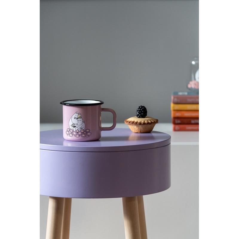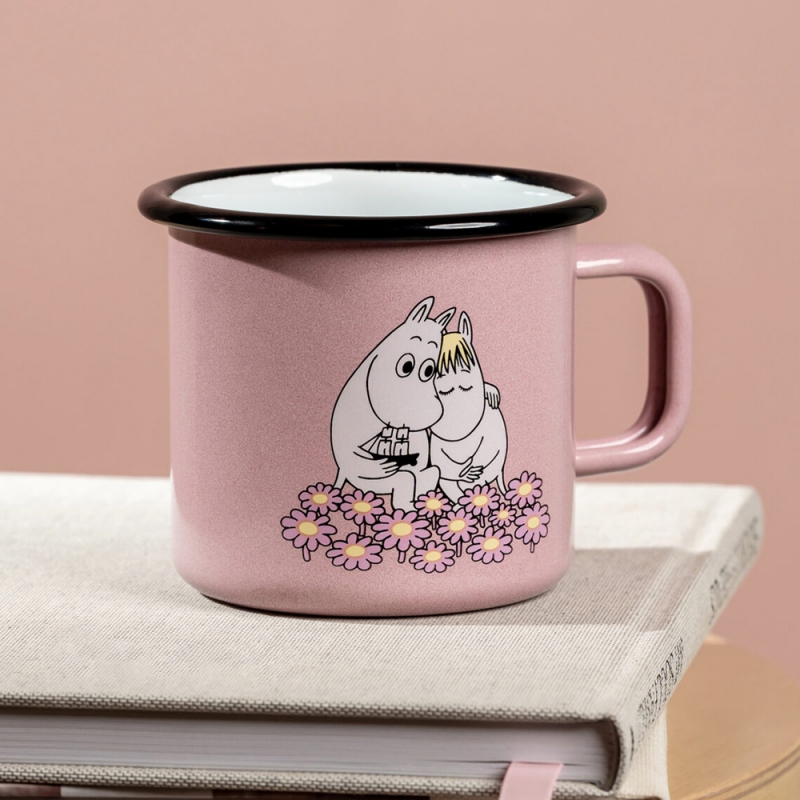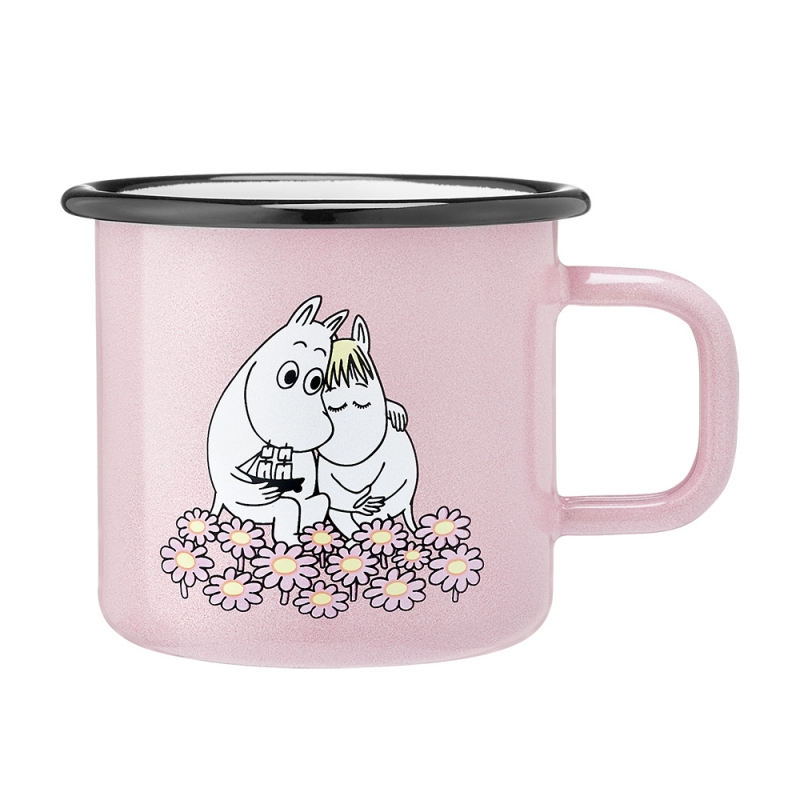 The pink enamel mug Together, with the motif of Moomin hugging Miss Ferce, will be a beautiful expression of affection for the person you love, for example on Valentine's Day.