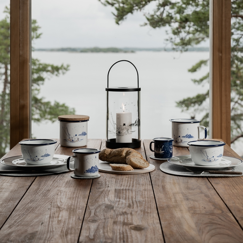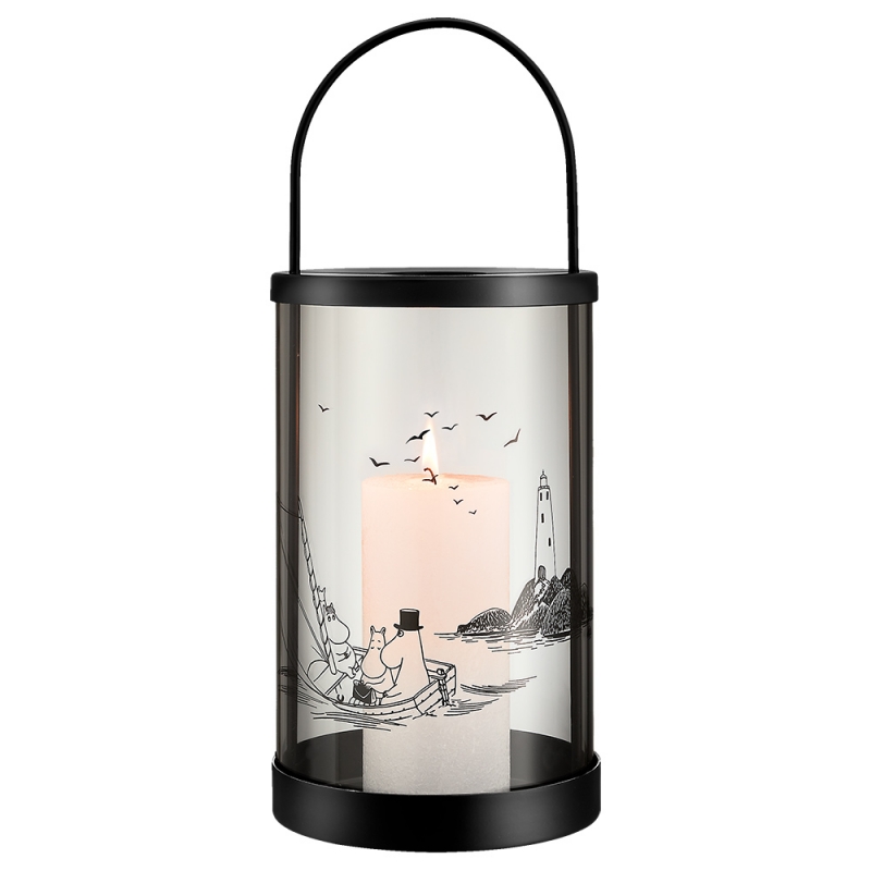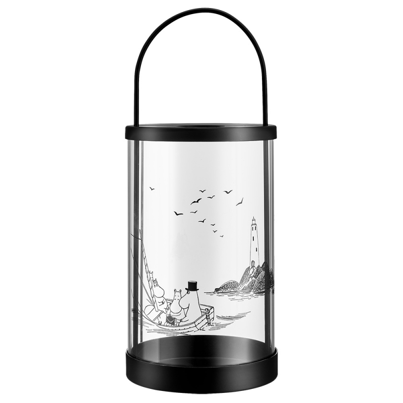 Sailors Hello! A beautiful lantern with the Sailors motif by the famous Finnish author Tove Jansson depicts the main characters on a boat and a lighthouse. A beautiful piece for summer evenings on the terrace or creating a cozy atmosphere throughout the year.