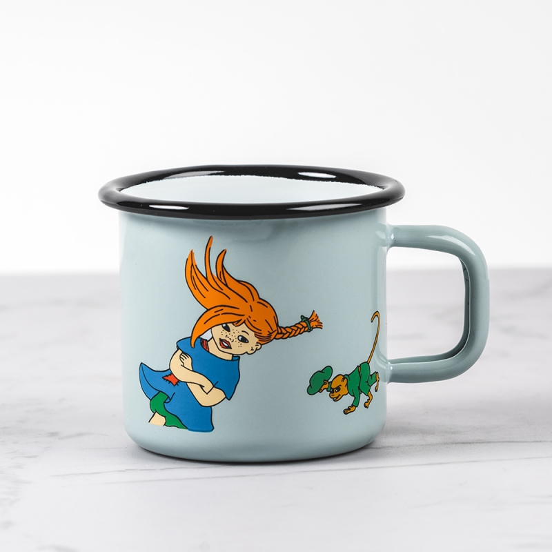 A beautiful enamel mug with the motif of the legendary character Pippi Longstocking, written by Astrid Lindgren and her illustrator Ingrid Vang Nyman. Pippi is strong in body and soul and can handle anything that comes her way.