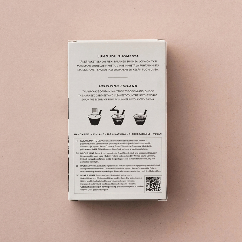 Sauna scent brings a unique combination of traditional Finnish sauna bathing with the invigorating freshness of mint. Dried Finnish birch leaves and carefully selected mint create a natural infusion that not only smells great in the sauna, but also gives a feeling of refreshment and deep relaxation. The bags are handmade in Finland and are easy to use - just pour hot water into them in a bucket, let them steep like tea, and then pour them over the stove.