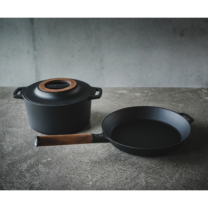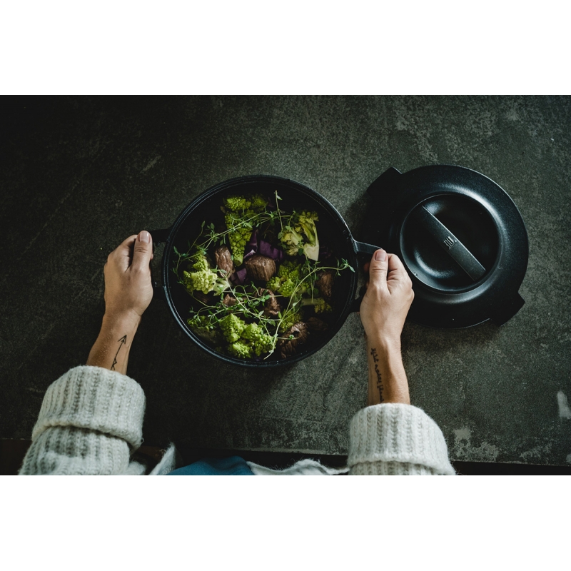 The cast iron is protected by the Thermium™ coating, which provides a natural non-stick surface even at high temperatures. The main components are natural silicon and oxygen applied in a very thin layer of 1 micron, which results in a very heat-resistant and chemically stable non-stick surface. The surface does not contain any heavy metals or plastics and is completely free of PFOA and PTFE, and there is no risk of chemical release even when heated to very high temperatures. Packaged in a designer gift box.