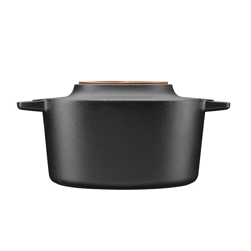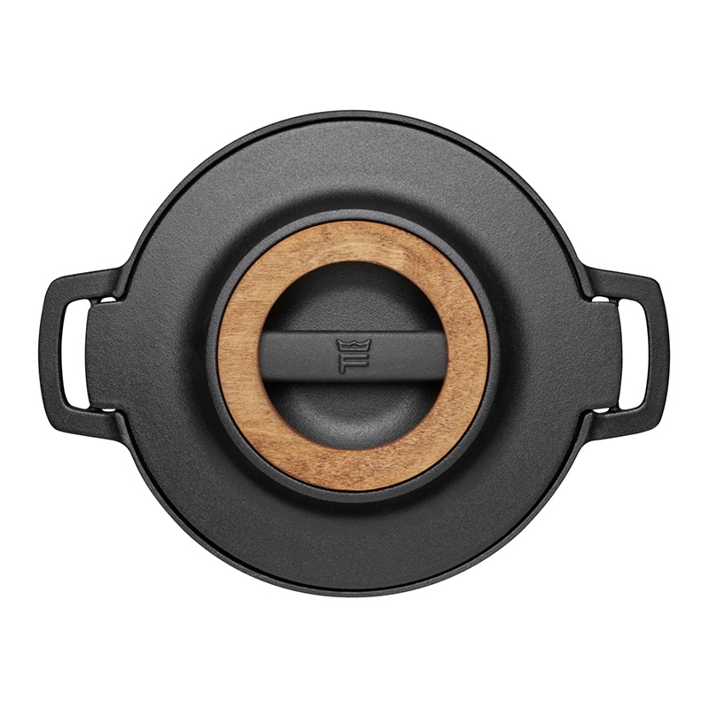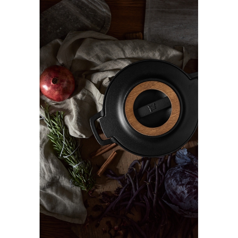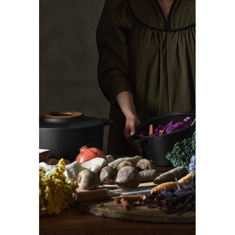 The robust Norden cast iron pot will not only win you over with its first-class quality and great cooking properties, but also with its timeless Nordic design. The typical emphasis on function is reflected in the practical wooden wheel, which serves as a stand for placing a hot pot or lid. You can also conveniently slide it into the handle of the pot itself when you need to work with it or serve from it. The solid cast iron ensures even heat distribution, whether you cook in the pot on the stove or bake in the oven.