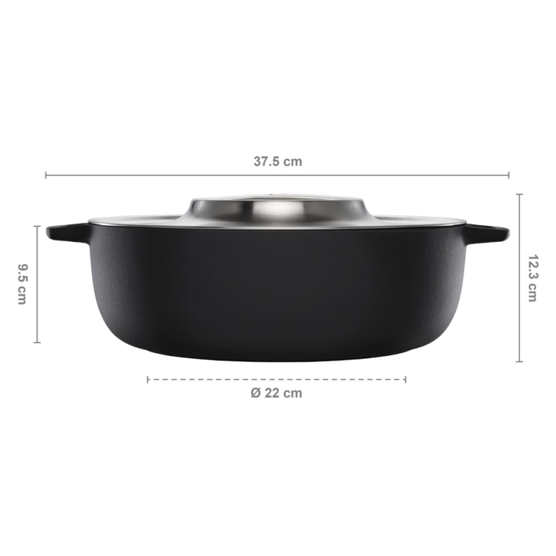 The cast iron is protected by the Thermium™ coating, which provides a natural non-stick surface even at high temperatures. The main components are natural silicon and oxygen applied in a very thin layer of 1 micron, which results in a very heat-resistant and chemically stable non-stick surface. The surface does not contain any heavy metals or plastics and is completely free of PFOA and PTFE, and there is no risk of chemical release even when heated to very high temperatures. Packaged in a designer gift box.
