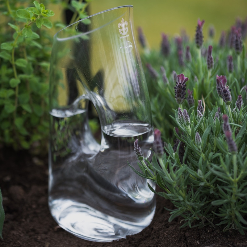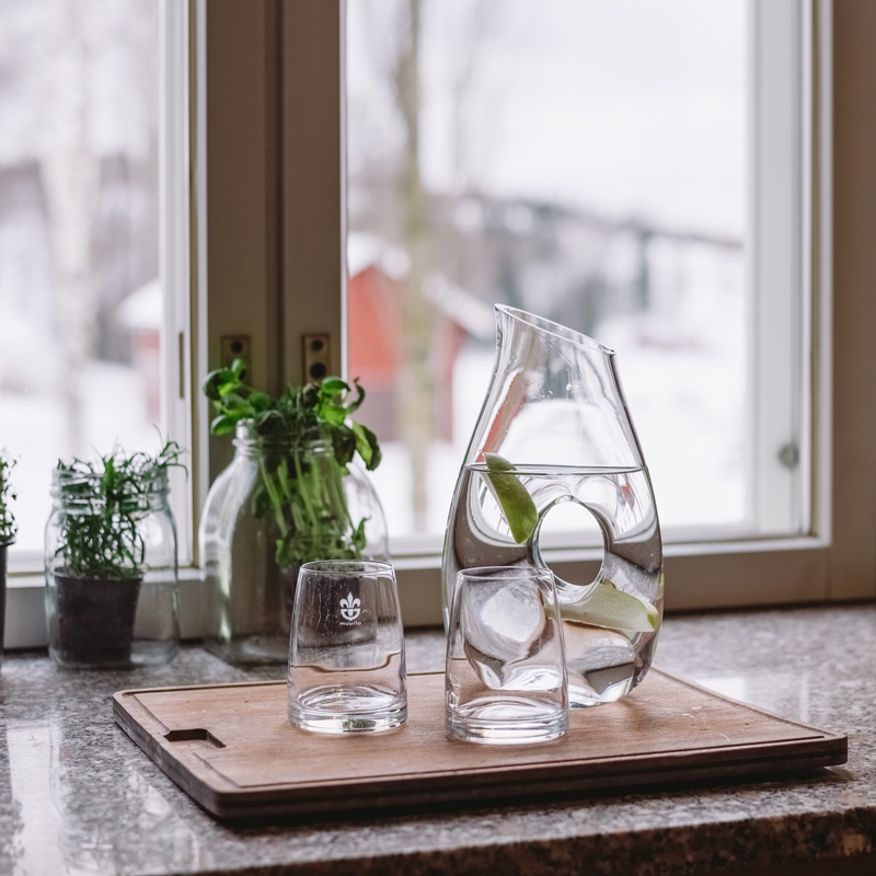 A designer and very practical glass jug. Thanks to its handmade production, each piece is original. An interesting element is the handle, which is a refined part of the body of the jug. But that's not all - thanks to the well-thought-out shape of the neck, lemon or ice will not slip into the glass.